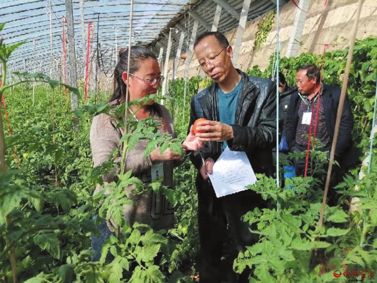趙建華(右前)在大棚仔細(xì)檢查番茄長(zhǎng)勢(shì)