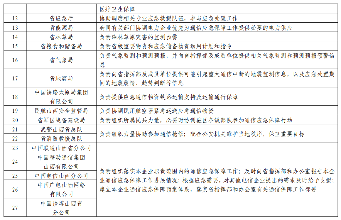 成員:省通信管理局、省委宣傳部、省委網(wǎng)信辦、省發(fā)展改革委、省公安廳、省財(cái)政廳、省自然資源廳、省交通廳、省水利廳、省衛(wèi)健委、省應(yīng)急廳、省能源局、省林草局、省糧食和儲(chǔ)備局、省氣象局、省地震局、中國(guó)鐵路太原局集團(tuán)有限公司、民航山西安全監(jiān)管局、省軍區(qū)戰(zhàn)備建設(shè)局、武警山西省總隊(duì)、省消防救援總隊(duì)以及省基礎(chǔ)電信企業(yè)等部門(mén)單位相關(guān)負(fù)責(zé)人。