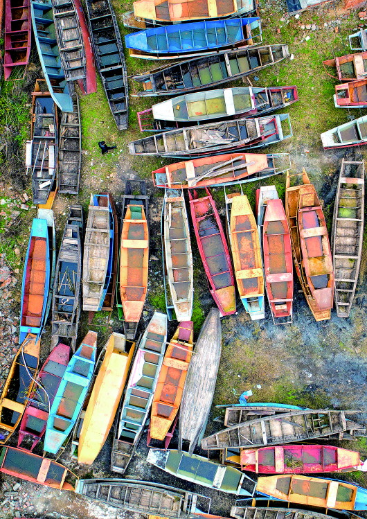 ▲湖北省宜都市枝城鎮(zhèn)白水港村一處“上岸”的漁船堆放點(diǎn)(無(wú)人機(jī)照片),這些收回的漁船將被集中拆解(2020年1月2日攝)。