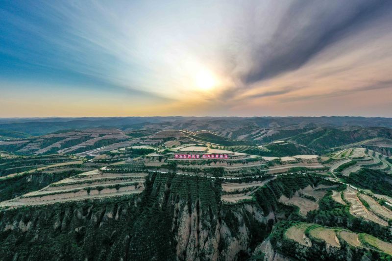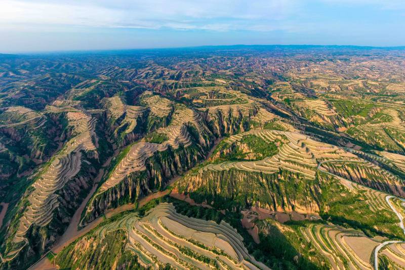 站在永和梯田觀景臺上,一壟壟地膜像一條條白色的絲帶,纏繞在層層疊疊的梯田間。連綿的山坡間、山塬上,鋪滿了綠色的盛裝——油松、連翹,還有地里的高粱苗,正孕育著無限的生機活力。