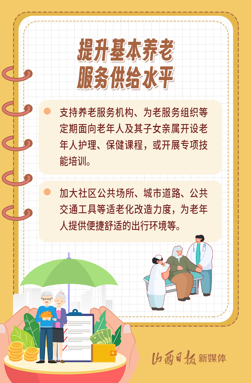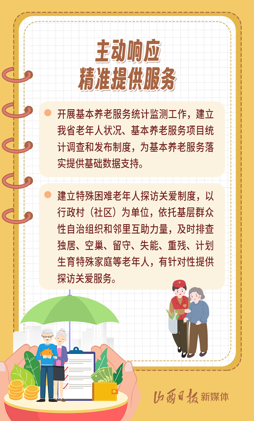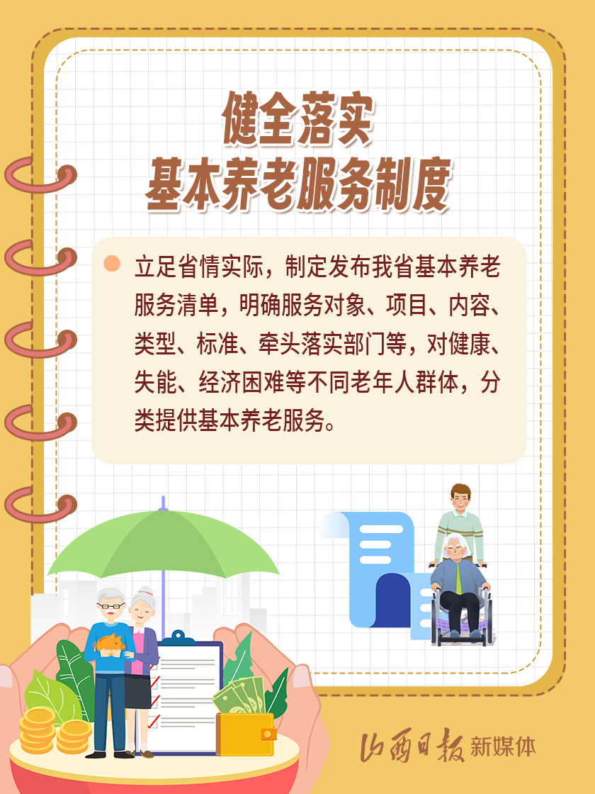 近日,我省出臺《山西省基本養(yǎng)老服務(wù)體系建設(shè)實施方案》,以積極應(yīng)對全省人口老齡化,扎實推進基本養(yǎng)老服務(wù)體系建設(shè),切實提高基本養(yǎng)老服務(wù)的公平性、可及性,不斷增強老年人的獲得感、幸福感、安全感。