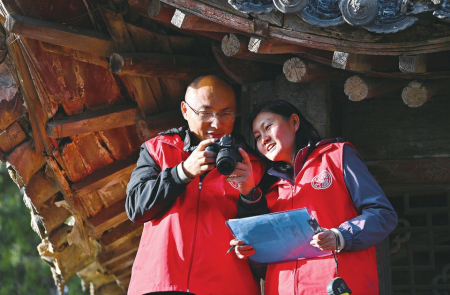 4月10日,張東星(左)、王燕燕在對山門木基層修繕痕跡拍照后進行現(xiàn)場分析。