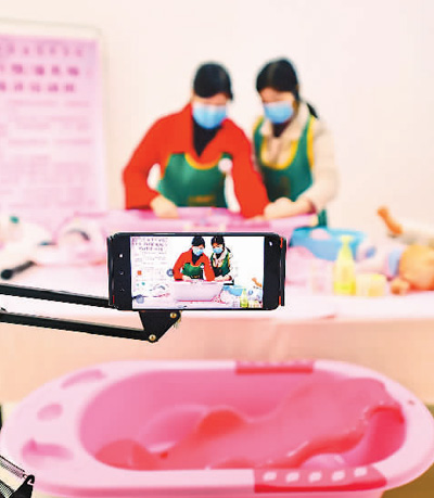在江西省贛州市會(huì)昌縣人和職業(yè)技術(shù)學(xué)校線上技能培訓(xùn)班,培訓(xùn)師通過(guò)網(wǎng)絡(luò)直播的方式,免費(fèi)向貧困地區(qū)婦女勞動(dòng)力講解母嬰護(hù)理技能。