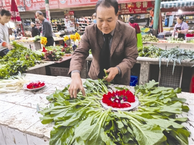 “那時孩子在成都理工大學(xué)上學(xué),家里經(jīng)濟壓力很大?!?年前,王美成接替妻子開始在城區(qū)賣菜,他發(fā)現(xiàn)有時菜并不好賣?!坝幸淮挝胰ゾ频陞⒓友鐣?,看到酒店里有的菜品裝飾挺好看,我就想是不是也可以把花裝飾在菜攤上。嘗試之后發(fā)現(xiàn)效果挺好,大家都喜歡?!?/span>