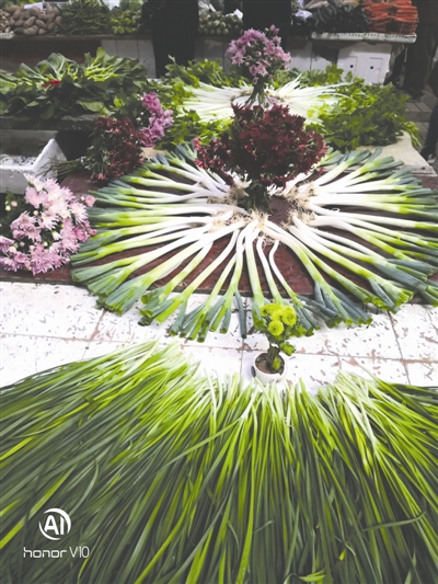 于是,王美成撿來廢棄的酒瓶子當(dāng)花瓶插花,每一處花瓶下擺放的都是不一樣的蔬菜,每天攤位上能見著七八種不同形狀的蔬菜造型花樣。6年來,他一直堅持?jǐn)[攤,在不同的季節(jié)用不同的鮮花進行搭配。