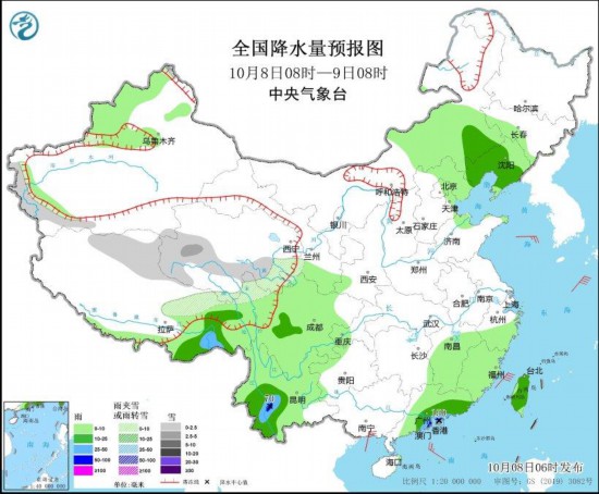 圖1 全國降水量預(yù)報圖(10月8日08時-9日08時)