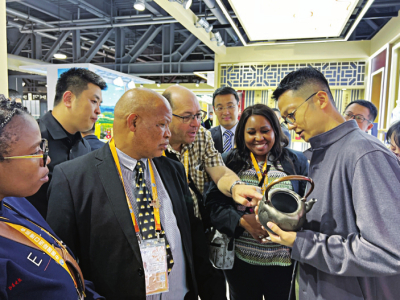 芮城布藝、平遙推光漆器、長治八義窯紅綠彩瓷器、晉城晉藝坊鐵壺……一件件制作精美的非遺、文創(chuàng)展品引來眾多觀展者駐足欣賞。晉韻堂鐵壺作為晉城市的一張名片,代表山西省非遺參展。晉韻堂上海店負責人李艷偉這次帶來了熱銷款和新品。一款名為“四不猴”的鐵藝雕塑作品,將頭戴官帽的四只憨態(tài)可掬的鐵猴子雕刻得惟妙惟肖。看到幾位南非客商對晉韻堂鐵壺感興趣,晉韻堂鐵壺總部總經(jīng)理晉曉用流利的英語向他們熱情推介。