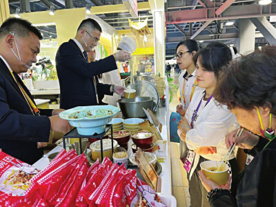 進博會山西展廳現(xiàn)場,汾酒、老陳醋、鐵壺、瓷器等老字號產(chǎn)品抓人眼球之外,展廳中心位置的山西美食專區(qū)尤其受大眾歡迎。