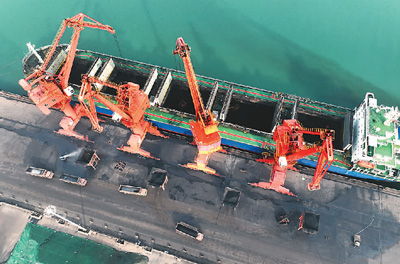 連日來,江蘇連云港港加快冬季電煤運輸和儲備,全力保障發(fā)電企業(yè)供暖用煤需求。圖為11月22日,貨輪在連云港港煤炭碼頭卸載電煤。王 春攝(人民視覺)