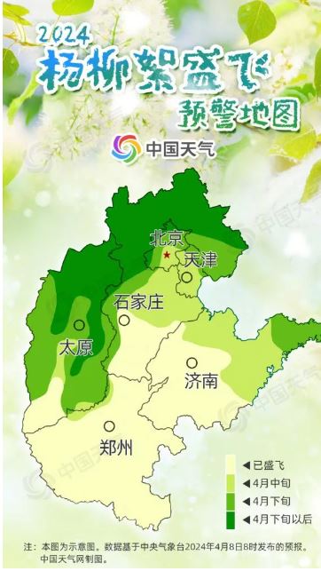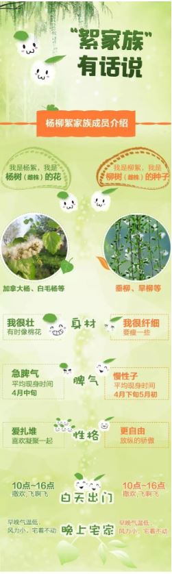 以華北地區(qū)最早開始飄絮的白毛楊為例,當日平均氣溫大于0℃時,白毛楊才能正常生長發(fā)育,將這些超過0℃的數(shù)值累加起來,當總和達到480℃,且日平均氣溫達到14℃,楊絮就開始飄飛。華北一帶,往往4月上旬前后達到這一標準。楊絮飄飛10余天后,柳絮也會進入飄飛期。