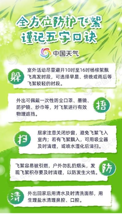 隨風飄散的飛絮可能會攜帶花粉、粉塵等物質(zhì)入侵人體呼吸道,引發(fā)皮膚或呼吸系統(tǒng)的過敏癥狀,且楊柳絮屬于易燃物,遇到明火會迅速燃燒蔓延,甚至引燃其他可燃物,釀成火災。記住五字口訣,全方位防護擾人的“四月雪”。