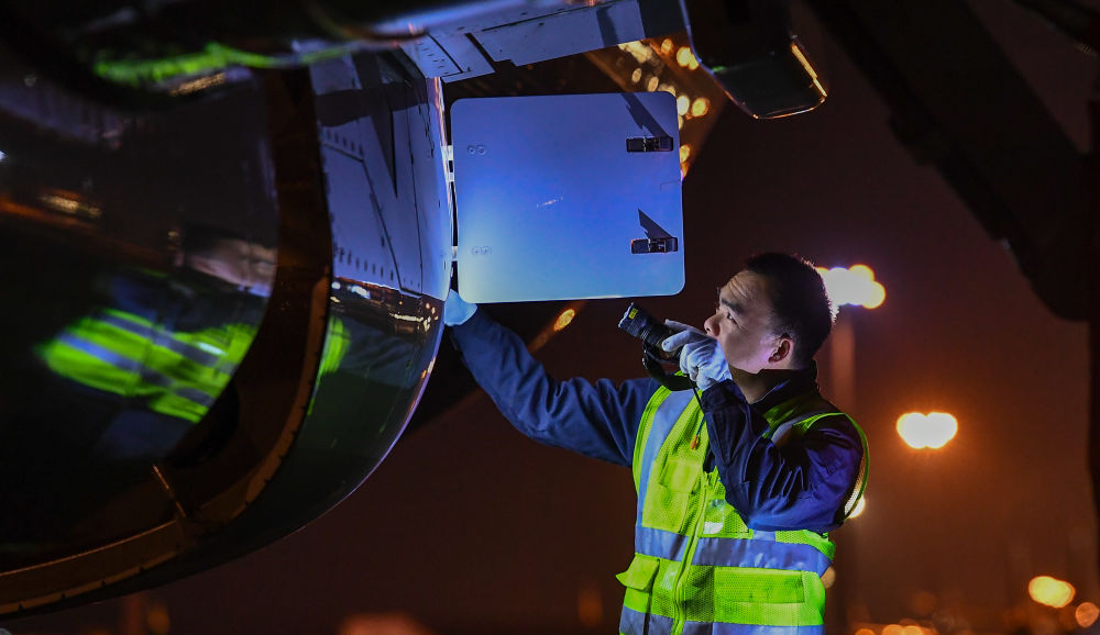 1月11日,在??诿捞m國(guó)際機(jī)場(chǎng)停機(jī)坪上,南航工程技術(shù)分公司機(jī)務(wù)工程師對(duì)飛機(jī)進(jìn)行深度檢查。新華社記者 楊冠宇 攝