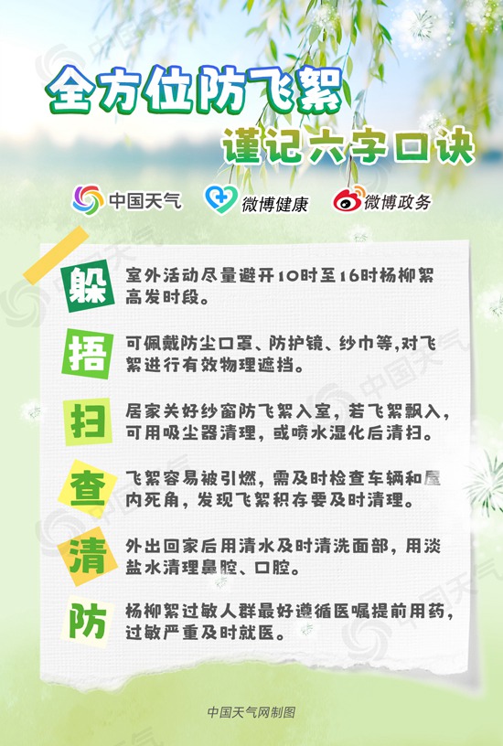 京津冀楊柳絮飄飛可持續(xù)至5月,飛絮中或攜帶花粉、灰塵等多種過敏原,被人體吸入后,易引發(fā)過敏性鼻炎、哮喘等疾病。飛絮如何防?如何降低過敏風(fēng)險(xiǎn)?中國天氣網(wǎng)總結(jié)了躲、捂、掃、查、清、防6字口訣,助你全方位防護(hù)飛絮。