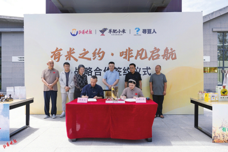 羊肥小米董事長杜紅雁與云南尋豆人董事長郭濤簽訂合作協(xié)議。