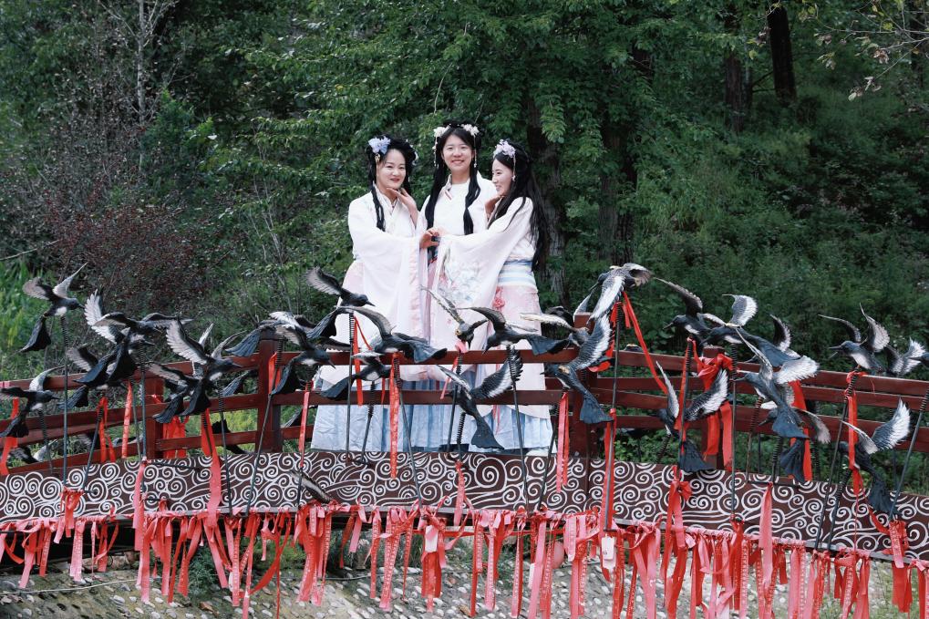 游客在鵲橋景觀處拍照打卡。新華社記者 張哲 攝 南天池村東一公里處的“天河梁”橫亙南北,猶如一壁天然屏風(fēng),形成環(huán)境怡然的“世外桃源”;“牛郎峪村”是故事中牛郎居住的地方;“喜鵲山”因有喜鵲棲息而得名;“天池”則是織女沐浴的地方;“南天門”更是傳說中仙女下凡的必經(jīng)之路。這些地名串起了一條較為完整的牛郎織女傳說鏈。
