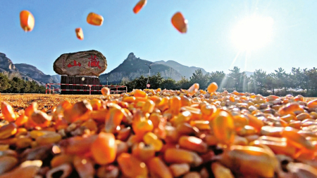 從空中俯瞰,景區(qū)標(biāo)志性的刻有“藏山”字樣的巨石,被連片的玉米“花?!杯h(huán)繞,綿延千米的道路上,玉米粒被村民們精心鋪成整齊的波紋狀,宛如一條流淌的金色長(zhǎng)河。“今年景區(qū)把這么寬的路讓給我們晾曬糧食,真的解決了我們一大難題!”正在翻曬玉米的村民李師傅說(shuō)道。