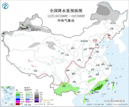 12月18日08時至19日08時,內(nèi)蒙古東北部、黑龍江中北部、新疆北部和南疆西部山區(qū)、甘肅河西等地部分地區(qū)有小到中雪或雨夾雪,其中,新疆沿天山地區(qū)和伊犁河谷局地有大到暴雪(10~16毫米)。湖南南部、福建東部和南部、西南地區(qū)南部、廣西西南部、廣東東部和南部、海南島東部、臺灣島東部等地部分地區(qū)有小到中雨,其中,廣東東部局地有大雨(25~35毫米)。遼寧東部、西藏中北部等地部分地區(qū)有4~6級風;臺灣海峽、巴士海峽、南海東北部和中東部海域將有5~7級大風、陣風8級。