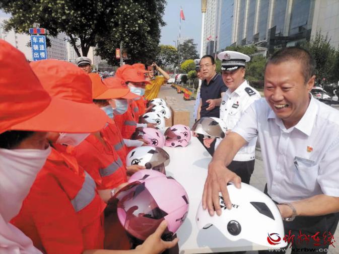 今年是我市創(chuàng)建全國文明城市的決戰(zhàn)決勝年,廣大環(huán)衛(wèi)工人一直默默奮斗在崗位上,為我市創(chuàng)文不斷努力。市公安局交警支隊始終牽掛著奮戰(zhàn)在基層一線的環(huán)衛(wèi)工人,支隊以此次贈送頭盔活動為契機,持續(xù)關(guān)心關(guān)愛環(huán)衛(wèi)工人的生命安全和身體健康。市公安局交警支隊負責(zé)人表示:“環(huán)衛(wèi)工人大多騎著電動三輪車或人力保潔車穿梭在大街小巷,機動車道是他們的主要作業(yè)區(qū)之一,佩戴安全頭盔,可以大大增加他們的安全系數(shù)。同時,環(huán)衛(wèi)等重點行業(yè)的示范引領(lǐng)作用,將有力帶動市民遵紀(jì)守法、安全出行,為文明城市創(chuàng)建打造一道亮麗的風(fēng)景線?!眻D為捐贈活動現(xiàn)場。張志遠 攝影報道