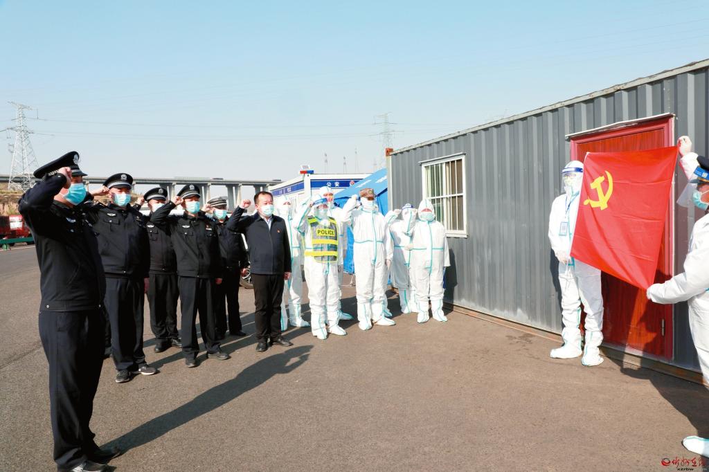 疫情防控一線(xiàn)工作人員在黨旗下宣誓