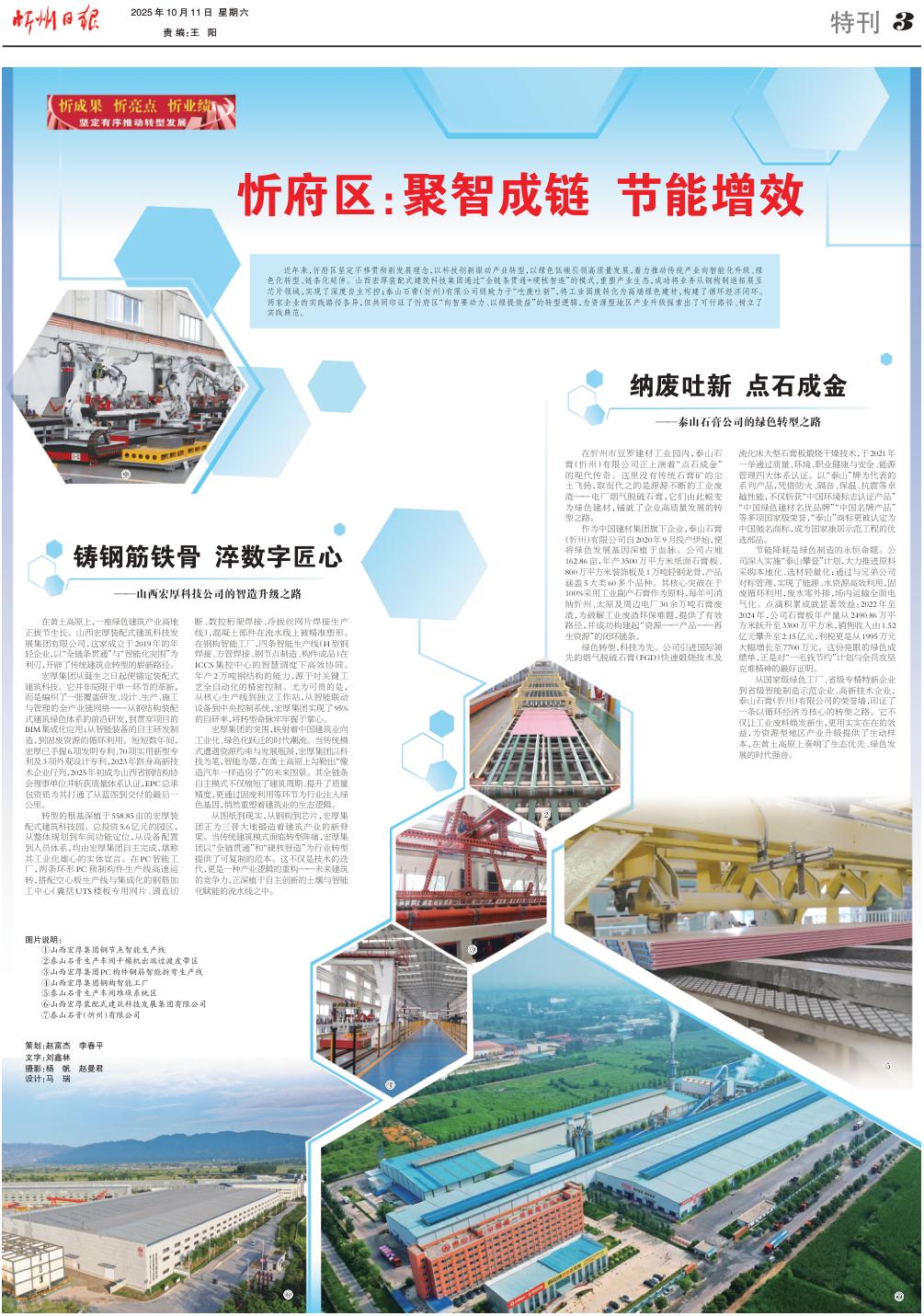 近年來,忻府區(qū)堅(jiān)定不移貫徹新發(fā)展理念,以科技創(chuàng)新驅(qū)動(dòng)產(chǎn)業(yè)轉(zhuǎn)型,以綠色低碳引領(lǐng)高質(zhì)量發(fā)展,著力推動(dòng)傳統(tǒng)產(chǎn)業(yè)向智能化升級(jí)、綠色化轉(zhuǎn)型、鏈條化延伸。山西宏厚裝配式建筑科技集團(tuán)通過“全鏈條貫通+硬核智造”的模式,重塑產(chǎn)業(yè)生態(tài),成功將業(yè)務(wù)從鋼構(gòu)制造拓展至芯片領(lǐng)域,實(shí)現(xiàn)了深度自主可控;泰山石膏(忻州)有限公司則致力于“吃廢吐新”,將工業(yè)固廢轉(zhuǎn)化為高端綠色建材,構(gòu)建了循環(huán)經(jīng)濟(jì)閉環(huán)。兩家企業(yè)的實(shí)踐路徑各異,但共同印證了忻府區(qū)“向智要?jiǎng)恿?、以綠提效益”的轉(zhuǎn)型邏輯,為資源型地區(qū)產(chǎn)業(yè)升級(jí)探索出了可行路徑、樹立了實(shí)踐典范。