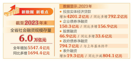 數(shù)據(jù)顯示,2023年,投放實體經(jīng)濟貸款增加4201.2億元,同比多增792.2億元,支撐力度依然穩(wěn)固;企業(yè)債券凈融資150.3億元,同比多增156.9億元;股票融資46.9億元,同比多增33.6億元;政府債券凈融資794.7億元,與上年基本持平;表外融資增加19.3億元,同比少減804.1億元。