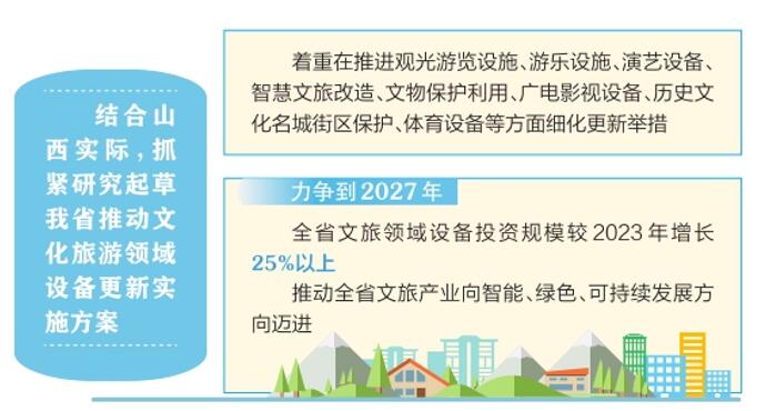 系統(tǒng)推進(jìn),夯實重點任務(wù)。結(jié)合山西實際,抓緊研究起草我省推動文化旅游領(lǐng)域設(shè)備更新實施方案,著重在推進(jìn)觀光游覽設(shè)施、游樂設(shè)施、演藝設(shè)備、智慧文旅改造、文物保護(hù)利用、廣電影視設(shè)備、歷史文化名城街區(qū)保護(hù)、體育設(shè)備等方面細(xì)化更新舉措,明確更新提升重點,力爭到2027年,全省文旅領(lǐng)域設(shè)備投資規(guī)模較2023年增長25%以上,推動全省文旅產(chǎn)業(yè)向智能、綠色、可持續(xù)發(fā)展方向邁進(jìn)。