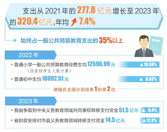 本報(bào)訊(記者任志霞)6月13日,記者從省財(cái)政廳獲悉,全省義務(wù)教育支出從2021年的277.8億元增長(zhǎng)至2023年的320.4億元,年均增長(zhǎng)7.4%,始終占一般公共預(yù)算教育支出的35%以上,義務(wù)教育優(yōu)質(zhì)均衡發(fā)展得到切實(shí)保障。 近年來(lái),我省財(cái)政部門把義務(wù)教育作為重中之重優(yōu)先保障。2023年,我省爭(zhēng)取到中央義務(wù)教育領(lǐng)域共同事權(quán)轉(zhuǎn)移支付資金51.5億元,增長(zhǎng)6.4%;同時(shí),省財(cái)政安排對(duì)市縣義務(wù)教育領(lǐng)域轉(zhuǎn)移支付資金14.5億元,增長(zhǎng)12.3%。據(jù)全國(guó)教育經(jīng)費(fèi)執(zhí)行情況統(tǒng)計(jì)最新公告數(shù)據(jù),2022年,我省普通小學(xué)一般公共預(yù)算教育經(jīng)費(fèi)生均12596.99元(按在校學(xué)生人數(shù)計(jì)算),增長(zhǎng)10.38%,普通初中生均18092.51元,增長(zhǎng)8.83%,增幅在全國(guó)分別排第1和第2位。 在促進(jìn)縣域義務(wù)教育協(xié)調(diào)發(fā)展方面,省財(cái)政采取分類分檔方式差別化確定省與市縣支出責(zé)任,省級(jí)義務(wù)教育資金分配向46個(gè)重點(diǎn)幫扶縣傾斜,著力縮小區(qū)域間辦學(xué)條件差距。2023年以來(lái)省財(cái)政對(duì)先期接受國(guó)家督導(dǎo)評(píng)估認(rèn)定的5個(gè)縣給予專項(xiàng)資金補(bǔ)助,支持補(bǔ)齊短板弱項(xiàng),優(yōu)化資源配置,更好發(fā)揮示范帶動(dòng)作用。 在推動(dòng)城鄉(xiāng)教育一體化發(fā)展方面,省財(cái)政持續(xù)提高義務(wù)教育學(xué)校公用經(jīng)費(fèi)基準(zhǔn)定額。從2023年春季學(xué)期起,小學(xué)由生均650元/年提高到720元/年,初中由生均850元/年提高到940元/年。同時(shí),2023年中央和省級(jí)財(cái)政安排10.53億元,支持改善農(nóng)村義務(wù)教育學(xué)?;巨k學(xué)條件,有序擴(kuò)大城鎮(zhèn)學(xué)位供給。 在推動(dòng)師資配置均衡發(fā)展方面,2023年中央和省級(jí)財(cái)政下達(dá)7.3億元,積極支持實(shí)施農(nóng)村義務(wù)教育階段學(xué)校教師特崗計(jì)劃、“三區(qū)”人才教師支持計(jì)劃和銀齡計(jì)劃。對(duì)部分脫貧地區(qū)義務(wù)教育公辦學(xué)校在編在崗的鄉(xiāng)村教師給予生活補(bǔ)助,對(duì)原民辦代課教師給予教齡補(bǔ)貼。支持實(shí)施中小學(xué)幼兒園教師“國(guó)培計(jì)劃”和“省培計(jì)劃”,支持公費(fèi)師范生培養(yǎng)計(jì)劃。同時(shí),指導(dǎo)督促市縣健全工作機(jī)制,確保義務(wù)教育階段教師工資不低于當(dāng)?shù)毓珓?wù)員平均工資。 在支持適齡兒童平等接受義務(wù)教育方面,省財(cái)政認(rèn)真落實(shí)“兩免一補(bǔ)”政策,進(jìn)一步提高家庭經(jīng)濟(jì)困難學(xué)生資助精準(zhǔn)度。全省約340萬(wàn)學(xué)生免除學(xué)雜費(fèi)并免費(fèi)獲得教科書,30萬(wàn)家庭經(jīng)濟(jì)困難學(xué)生獲得生活補(bǔ)助。支持我省國(guó)家和地方計(jì)劃縣繼續(xù)實(shí)施好農(nóng)村義務(wù)教育學(xué)生營(yíng)養(yǎng)改善計(jì)劃,持續(xù)改善學(xué)生營(yíng)養(yǎng)健康狀況。 同時(shí),省財(cái)政不斷健全義務(wù)教育資金政策制度,提高支出效率,強(qiáng)化績(jī)效管理,持續(xù)提升義務(wù)教育領(lǐng)域資金政策效益。 (責(zé)任編輯:梁艷) |
