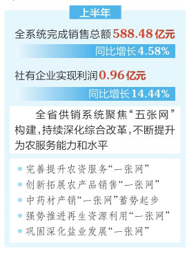 本報訊(記者高瑋)7月21日,全省供銷系統(tǒng)上半年經(jīng)濟運行分析暨“五張網(wǎng)”構(gòu)建現(xiàn)場推進會在長治市武鄉(xiāng)縣召開。今年以來,全省供銷系統(tǒng)以“五張網(wǎng)”構(gòu)建為統(tǒng)領,推動供銷工作全面提質(zhì)增效,經(jīng)濟運行穩(wěn)定向好。上半年,全系統(tǒng)完成銷售總額588.48億元,同比增長4.58%;社有企業(yè)實現(xiàn)利潤0.96億元,同比增長14.44%。