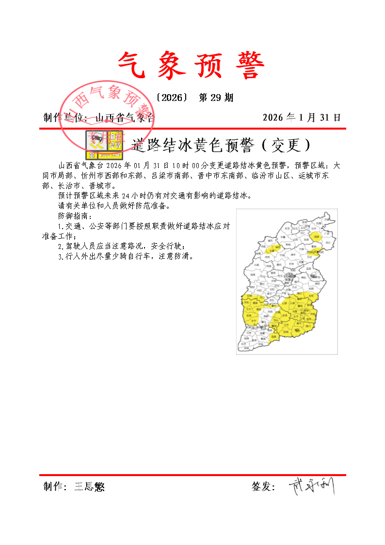 山西省氣象臺(tái)2026年01月31日10時(shí)00分變更道路結(jié)冰黃色預(yù)警,預(yù)警區(qū)域:大同市局部、忻州市西部和東部、呂梁市南部、晉中市東南部、臨汾市山區(qū)、運(yùn)城市東部、長(zhǎng)治市、晉城市。預(yù)計(jì)預(yù)警區(qū)域未來(lái)24小時(shí)仍有對(duì)交通有影響的道路結(jié)冰。請(qǐng)有關(guān)單位和人員做好防范準(zhǔn)備。防御指南:1.交通、公安等部門(mén)要按照職責(zé)做好道路結(jié)冰應(yīng)對(duì)準(zhǔn)備工作;2.駕駛?cè)藛T應(yīng)當(dāng)注意路況,安全行駛;3.行人外出盡量少騎自行車(chē),注意防滑。