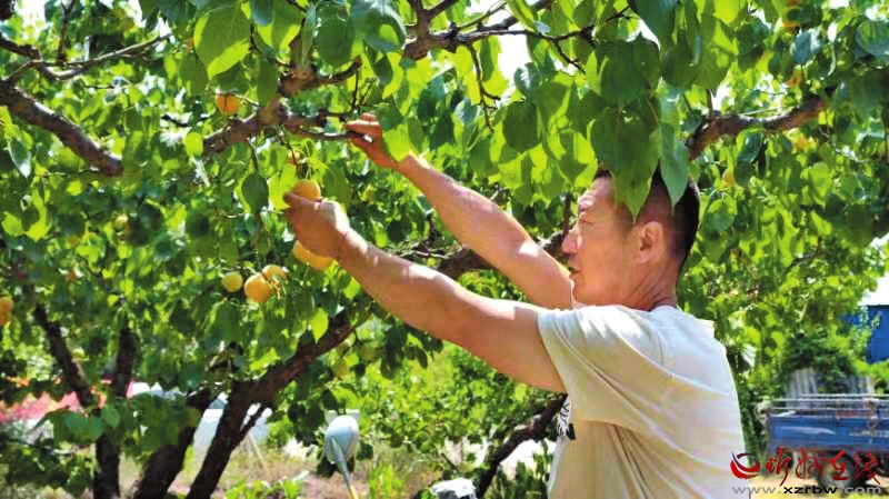 村民張連成每天早早地就來(lái)到自家杏園里摘杏,然后進(jìn)行挑選、裝箱,忙得不亦樂(lè)乎?!懊刻於寄芙拥讲簧儆唵?,為了保證杏的新鮮度,必須當(dāng)天現(xiàn)摘才行。”張連成一邊跟記者交談,一邊熟練地將白水杏挨個(gè)包好果網(wǎng)裝箱?!拔曳N了30畝的白水杏,一畝地差不多能產(chǎn)1000多斤,按照歷年的行情來(lái)說(shuō),差不多能掙七八萬(wàn)?!闭f(shuō)到收入,老張笑得合不攏嘴。