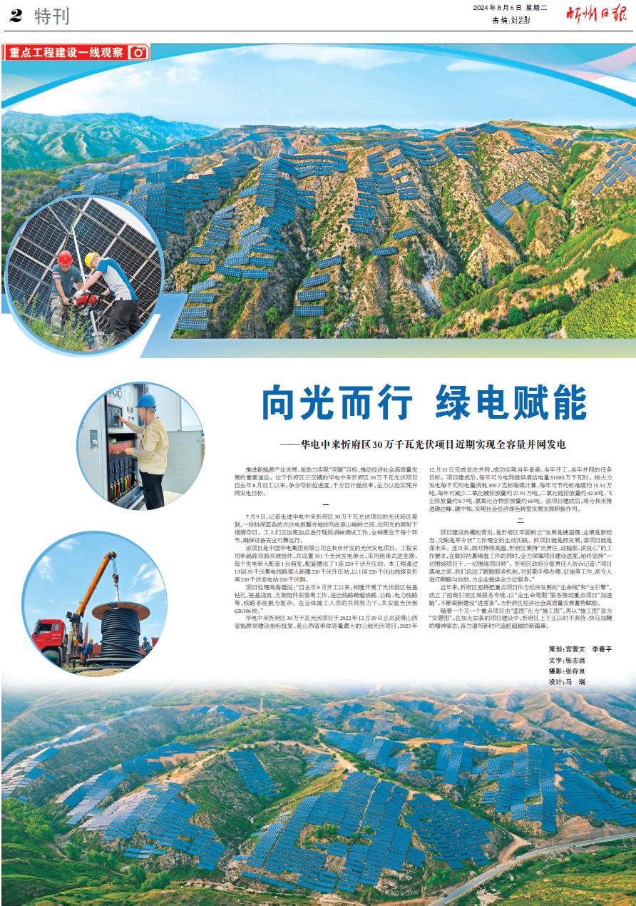7月9日,記者走進(jìn)華電中來忻府區(qū)30萬千瓦光伏項(xiàng)目的光伏場(chǎng)區(qū)看到,一排排深藍(lán)色的光伏電板整齊地排列在崇山峻嶺之間,在陽(yáng)光的照射下熠熠奪目。工人們正加班加點(diǎn)進(jìn)行現(xiàn)場(chǎng)消缺調(diào)試工作,全神貫注于每個(gè)環(huán)節(jié),確保設(shè)備安全可靠運(yùn)行。