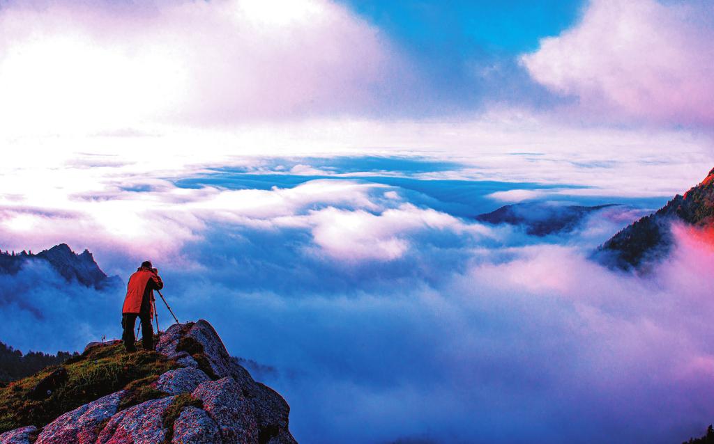 轉(zhuǎn)眼之間,已至蘆芽山腳。一路雨聲淅瀝,及至山腳已雨霽日出,一道七彩之虹凌空飛架。悟空定睛一看,雨后彩虹映射下,蘆芽山頂現(xiàn)金光萬道。那云天光閃處,偶爾有宮闕、仙人、山水、市井等圖景變幻,忽隱忽現(xiàn),忽明忽暗。這即是難得一見的蘆芽佛光,也是一處奇妙景觀。悟空亦心中暗道,這即是毗盧佛道場佛法的精義所在。許是心領神會,甚或心神契合,剎那,又聞劈空傳音,應是毗盧遮那佛臨別留偈,說的是:人生一場如游戲,緊箍須解悟空心;跟著悟空游蘆芽,靈駐雷鳴聽雷音。(付彥云)
