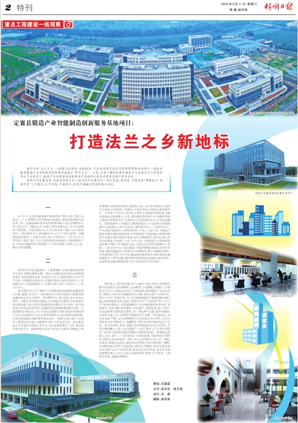 滹沱河畔、法蘭之鄉(xiāng),一座集行政審批、金融服務(wù)、產(chǎn)業(yè)咨詢及開發(fā)區(qū)行政管理等服務(wù)功能于一體的定襄縣鍛造產(chǎn)業(yè)智能制造創(chuàng)新服務(wù)基地正“拔節(jié)生長”。日前,記者了解到該服務(wù)基地五大功能區(qū)及公共服務(wù)項目已全部完工,鍛造產(chǎn)業(yè)智能制造創(chuàng)新服務(wù)產(chǎn)業(yè)鏈和總部經(jīng)濟發(fā)展態(tài)勢已初步形成。
