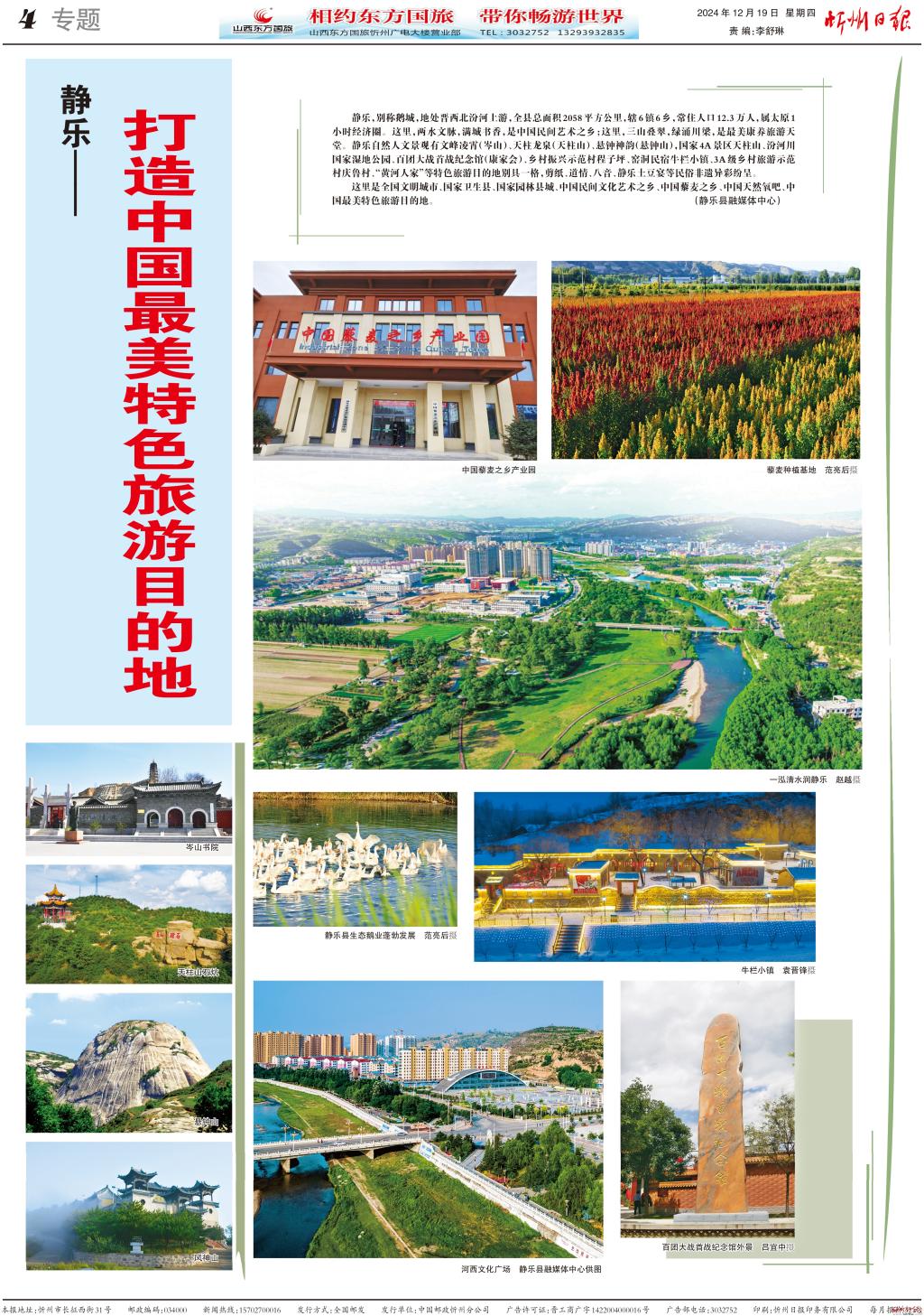 靜樂,別稱鵝城,地處晉西北汾河上游,全縣總面積2058平方公里,轄6鎮(zhèn)6鄉(xiāng),常住人口12.3萬人,屬太原1小時經(jīng)濟圈。這里,兩水文脈,滿城書香,是中國民間藝術之鄉(xiāng);這里,三山疊翠,綠涌川梁,是最美康養(yǎng)旅游天堂。靜樂自然人文景觀有文峰凌霄(岑山)、天柱龍泉(天柱山)、懸鐘神韻(懸鐘山),國家4A景區(qū)天柱山、汾河川國家濕地公園、百團大戰(zhàn)首戰(zhàn)紀念館(康家會)、鄉(xiāng)村振興示范村程子坪、窯洞民宿牛欄小鎮(zhèn)、3A級鄉(xiāng)村旅游示范村慶魯村、“黃河人家”等特色旅游目的地別具一格,剪紙、道情、八音、靜樂土豆宴等民俗非遺異彩紛呈。