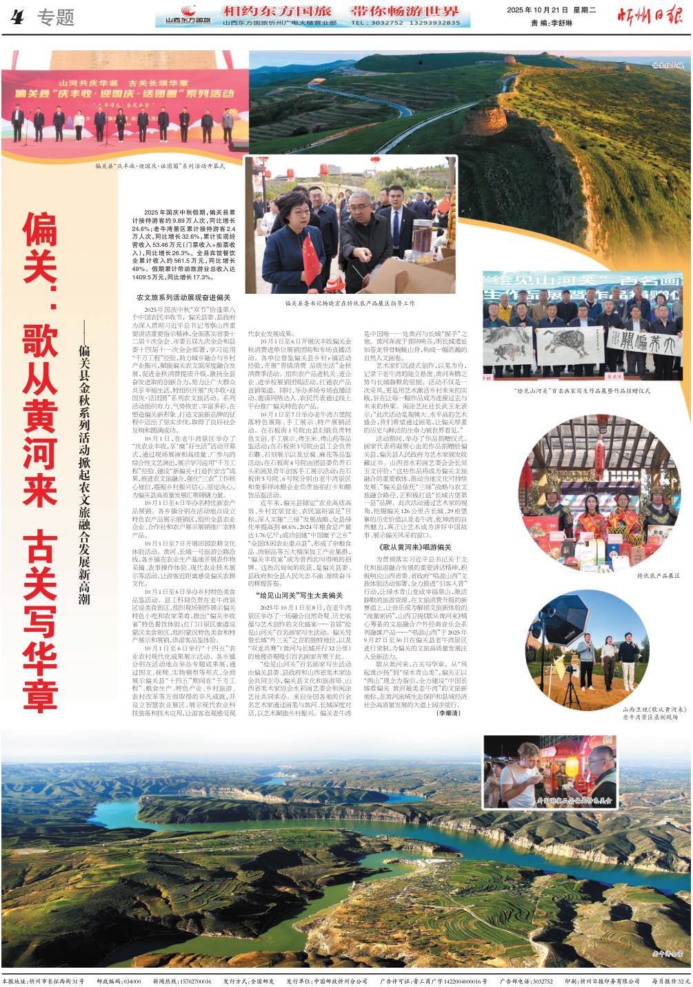 2025年國慶中秋假期,偏關(guān)縣累計接待游客約9.89萬人次,同比增長24.6%;老牛灣景區(qū)累計接待游客2.4萬人次,同比增長32.6%,累計實現(xiàn)經(jīng)營收入53.46萬元(門票收入+船票收入),同比增長26.3%。全縣賓館餐飲業(yè)累計收入約561.5萬元,同比增長49%。假期累計帶動旅游業(yè)總收入達(dá)1409.5萬元,同比增長17.3%。 農(nóng)文旅系列活動展現(xiàn)奮進(jìn)偏關(guān) 2025年國慶中秋“雙節(jié)”恰逢第八個中國農(nóng)民豐收節(jié),偏關(guān)縣委、縣政府為深入貫徹習(xí)近平總書記考察山西重要講話重要指示精神,全面落實省委十二屆十次全會、市委五屆九次全會和縣委十四屆十一次全會部署,學(xué)習(xí)運用“千萬工程”經(jīng)驗,助力城鄉(xiāng)融合與鄉(xiāng)村產(chǎn)業(yè)振興,賦能偏關(guān)農(nóng)文旅深度融合發(fā)展,促進(jìn)金秋消費提質(zhì)升級,激揚(yáng)全縣奮發(fā)進(jìn)取的創(chuàng)新合力,努力讓廣大群眾共享幸福生活,特組織開展“慶豐收·迎國慶·話團(tuán)圓”系列農(nóng)文旅活動。系列活動組織有力、氣勢恢宏、豐富多彩,在塑造偏關(guān)新形象、打造文旅新品牌的征程中邁出了堅實步伐,取得了良好社會反響和圓滿成功。 10月1日,在老牛灣景區(qū)舉辦了“慶農(nóng)業(yè)豐收,享‘糜’好生活”活動開幕式,通過現(xiàn)場展演和高質(zhì)量、廣參與的綜合性文藝演出,展示學(xué)習(xí)運用“千萬工程”經(jīng)驗、建設(shè)“新偏關(guān)·打造忻安吉”成果,推進(jìn)農(nóng)文旅融合,強(qiáng)化“三農(nóng)”工作核心地位,提振鄉(xiāng)村振興信心、堅定決心,為偏關(guān)縣高質(zhì)量發(fā)展匯聚磅礴力量。 10月1日至6日舉辦名特優(yōu)新農(nóng)產(chǎn)品展銷。各鄉(xiāng)鎮(zhèn)分別在活動地點設(shè)立特色農(nóng)產(chǎn)品展示展銷區(qū),組織全縣農(nóng)業(yè)企業(yè)、合作社和農(nóng)戶展示展銷推廣農(nóng)特產(chǎn)品。 10月1日至7日開展田園農(nóng)耕文化體驗活動。黃河、長城一號旅游公路沿線,各鄉(xiāng)鎮(zhèn)在農(nóng)業(yè)生產(chǎn)基地開展農(nóng)作物采摘、農(nóng)事操作體驗、現(xiàn)代農(nóng)業(yè)技術(shù)展示等活動,讓游客近距離感受偏關(guān)農(nóng)耕文化。 10月1日至6日舉辦鄉(xiāng)村特色美食品鑒活動??h工科局負(fù)責(zé)在老牛灣景區(qū)設(shè)美食街區(qū),組織現(xiàn)場制作展示偏關(guān)特色小吃和農(nóng)家菜肴,推出“偏關(guān)豐收宴”特色餐飲體驗;紅門口景區(qū)廊道設(shè)蒙漢美食街區(qū),組織蒙漢特色美食和特產(chǎn)展示和展銷,供游客品鑒體驗。 10月1日至6日舉行“十四五”農(nóng)業(yè)農(nóng)村現(xiàn)代化成果展示活動。各鄉(xiāng)鎮(zhèn)分別在活動地點舉辦專題成果展,通過圖文、視頻、實物模型等形式,全面展示偏關(guān)縣“十四五”期間在“千萬工程”、糧食生產(chǎn)、特色產(chǎn)業(yè)、鄉(xiāng)村旅游、農(nóng)村改革等方面取得的非凡成就,并設(shè)立智慧農(nóng)業(yè)展區(qū),展示現(xiàn)代農(nóng)業(yè)科技裝備和技術(shù)應(yīng)用,讓游客直觀感受現(xiàn)代農(nóng)業(yè)發(fā)展成果。 10月1日至6日開展慶豐收偏關(guān)金秋消費進(jìn)單位展銷團(tuán)購和專場直播活動。各單位借鑒偏關(guān)縣鄉(xiāng)村e鎮(zhèn)活動經(jīng)驗,開展“晉情消費品質(zhì)生活”金秋消費季活動。組織農(nóng)產(chǎn)品進(jìn)機(jī)關(guān)、進(jìn)企業(yè)、進(jìn)學(xué)校展銷團(tuán)購活動,打通農(nóng)產(chǎn)品直銷渠道。同時,舉辦多場專場直播活動,邀請網(wǎng)絡(luò)達(dá)人、農(nóng)民代表通過線上平臺推廣偏關(guān)特色農(nóng)產(chǎn)品。 10月1日至7日舉辦老牛灣古堡院落特色展陳、手工展示、特產(chǎn)展銷活動。在石板街1號院由縣婦聯(lián)負(fù)責(zé)特色文創(chuàng)、手工展示、烤玉米、烤山藥等品鑒活動;在石板街3號院由縣工會負(fù)責(zé)石雕、石刻展示以及豆腐、麻花等品鑒活動;在石板街4號院由團(tuán)縣委負(fù)責(zé)石頭彩畫及青年創(chuàng)客手工展示活動;在石板街5號院、6號院分別由老牛灣景區(qū)和榮泰祥冰醋企業(yè)負(fù)責(zé)旅拍打卡和醋飲品鑒活動。 近年來,偏關(guān)縣錨定“農(nóng)業(yè)高質(zhì)高效、鄉(xiāng)村宜居宜業(yè)、農(nóng)民富裕富足”目標(biāo),深入實施“三綠”發(fā)展戰(zhàn)略,全縣綠化率提高到48.6%,2024年糧食總產(chǎn)量達(dá)1.76億斤;成功創(chuàng)建“中國糜子之鄉(xiāng)”“全國休閑農(nóng)業(yè)重點縣”,形成了雜糧食品、肉制品等五大精深加工產(chǎn)業(yè)集群,“偏關(guān)豐收宴”成為晉西北叫得響的招牌。這些沉甸甸的收獲,是偏關(guān)縣委、縣政府和全縣人民矢志不渝、接續(xù)奮斗的輝煌答卷。 “繪見山河關(guān)”寫生大美偏關(guān) 2025年10月1日至8日,在老牛灣景區(qū)舉辦了一場融合自然奇觀、歷史底蘊(yùn)與藝術(shù)創(chuàng)作的文化盛宴——首屆“繪見山河關(guān)”百名畫家寫生活動。偏關(guān)憑借長城“外三關(guān)”之首的獨特地位,以及“雙龍共舞”(黃河與長城并行32公里)的地理奇觀吸引百名畫家齊聚于此。 “繪見山河關(guān)”百名畫家寫生活動由偏關(guān)縣委、縣政府和山西省美術(shù)家協(xié)會共同主辦,偏關(guān)縣