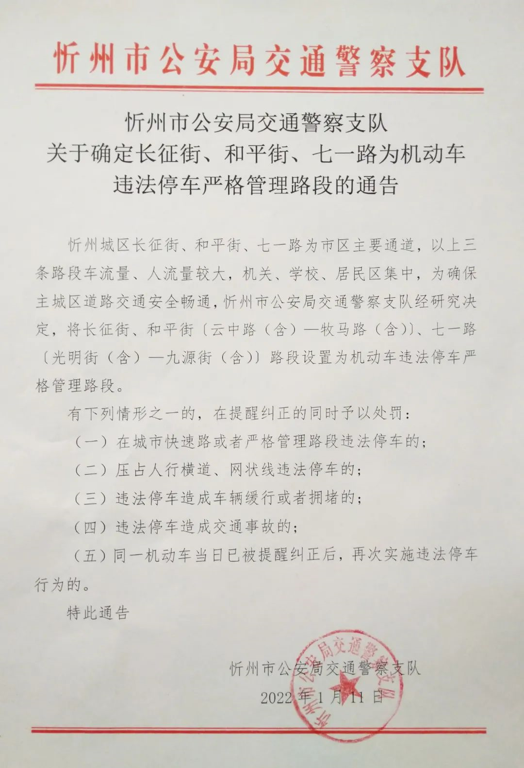忻州市公安局交通警察支隊關(guān)于確定長征街、和平街、七一路為機動車違法停車嚴(yán)格管理路段的通告