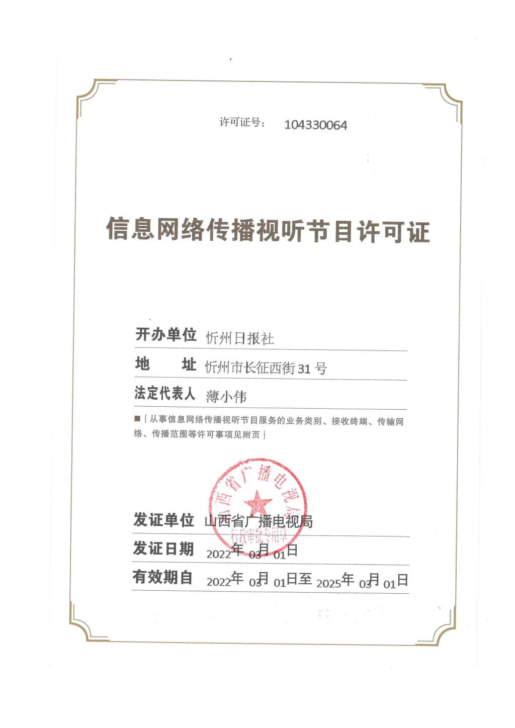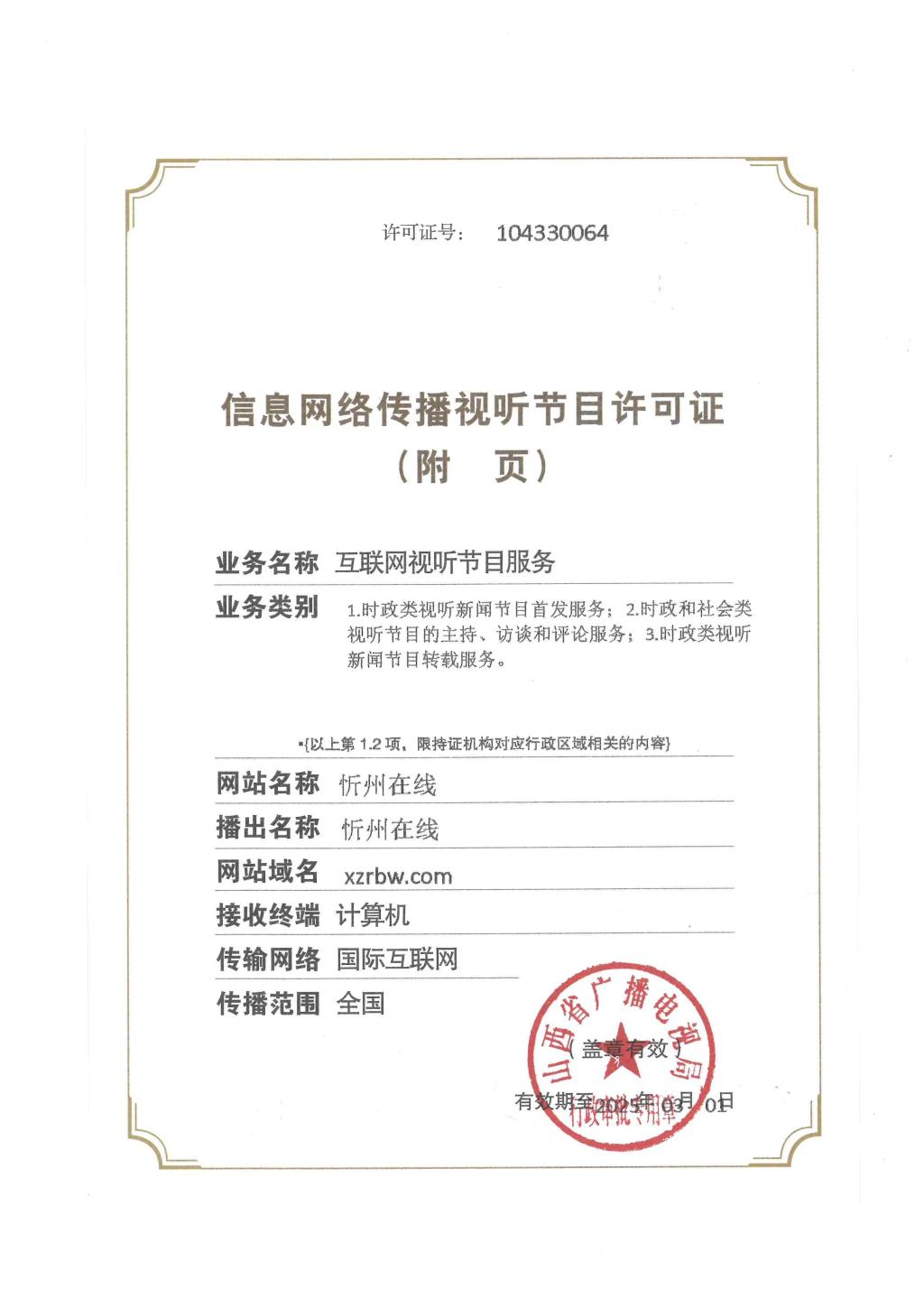忻州在線信息網(wǎng)絡(luò)傳播視聽節(jié)目許可證