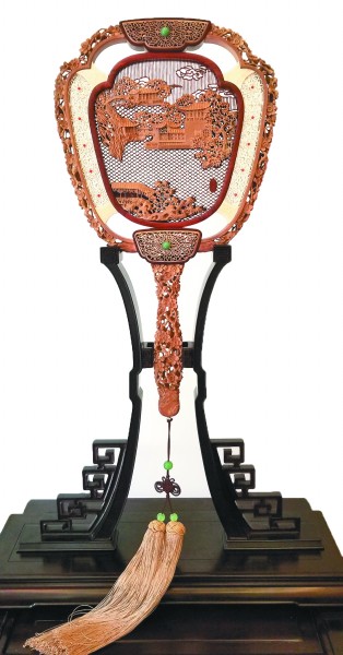 檀香木鏤雕宮扇“梅香舫舟” 邢偉中