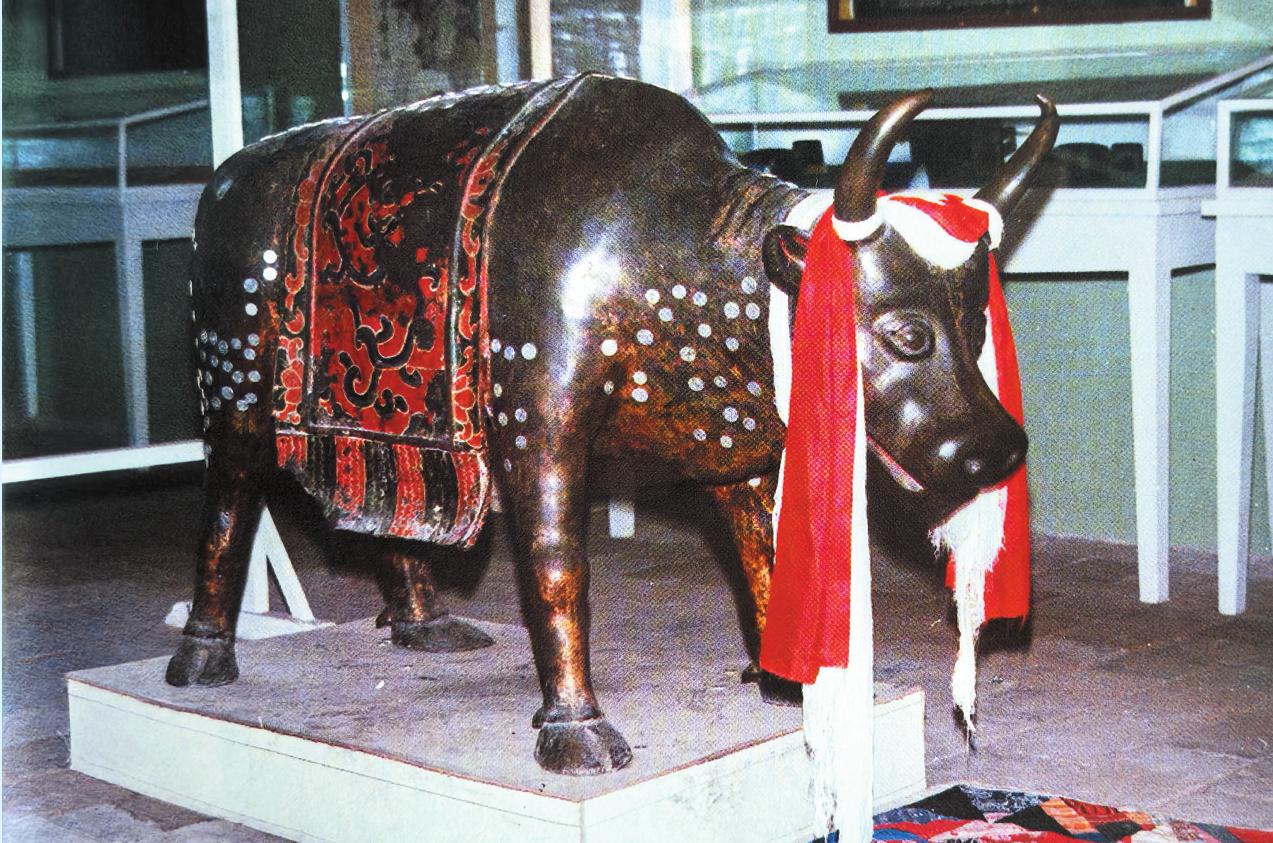 五臺(tái)山保存著一尊工藝精細(xì)、形態(tài)逼真、傳神入化的明代銅牛。這尊堪稱鑄造藝術(shù)品中佳品的銅牛,收藏在顯通寺藏珍樓內(nèi),通高85厘米,長(zhǎng)146厘米。它體魄雄偉,頭向前伸,分足而立,兩角內(nèi)收,閉嘴蓄力,圓目正視,奮力前行。銅牛四足協(xié)調(diào),造型逼真。銅牛的腰部有披墊,披墊上面繪有各種彩色花紋。銅牛原來(lái)還拉著一輛精致的銅車。車棚、輪、軸及車上的繩索均為銅質(zhì)。文物部門鑒定其為國(guó)家一級(jí)文物。