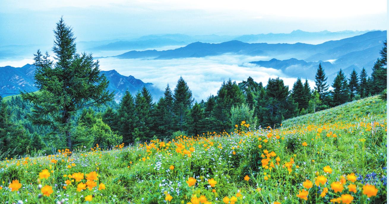 駝梁地形四周封閉,中為谷地,形成了山巒綿亙、溝壑縱橫、河川橫跨東西的自然生態(tài)景觀。其主峰海拔2281米,為“晉冀兩省四縣”交匯處,駝峰山巒蜿蜒,此起彼伏,猶如“靜臥巨駝”而取名駝梁。與五臺(tái)山風(fēng)景名勝區(qū)東北相望,遙相呼應(yīng),有其獨(dú)特和不可替代之優(yōu)勢(shì),同為五臺(tái)山旅游資源亮點(diǎn)。由山谷到山頂分布著落葉林混交林帶、樺樹(shù)林帶、落葉松林帶,生物垂直分布變化明顯。駝梁頂部,有一片亞高山草甸,約近萬(wàn)畝的茵茵綠草,像碩大無(wú)比的地毯,與天際交接,一望無(wú)垠。隱于藍(lán)天白云和松林綠波之間,散落著漫山遍野的杜鵑花、金蓮花、百合花、燈籠花等,置身其間,如進(jìn)花海,恍若仙境。因位于云霧縹緲的高山之巔,故被人譽(yù)為“云頂花海”。