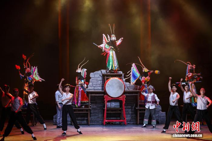 圖為演出現(xiàn)場。 記者 瞿宏倫 攝 《山河同心》將屯堡地戲、苗族歌舞、布依族音樂等傳統(tǒng)藝術(shù)形式與現(xiàn)代舞臺(tái)表現(xiàn)手法有機(jī)融合,通過歌舞的形式,講述抗日戰(zhàn)爭時(shí)期,安順各族民眾紛紛送兒上前線的故事,集中呈現(xiàn)貴州的民族文化,展現(xiàn)貴州各族兒女在抗日戰(zhàn)爭中的家國情懷和民族大義。 角色“陳天龍”飾演者李家霖接受媒體采訪時(shí)說,“能參與這部劇很幸運(yùn),一流的劇本、音樂和導(dǎo)演團(tuán)隊(duì),都是十分難得的?!痹诶罴伊乜磥?,“陳天龍”是一座橋梁,詮釋出傳統(tǒng)藝人在民族危亡時(shí)刻的堅(jiān)守與轉(zhuǎn)變。