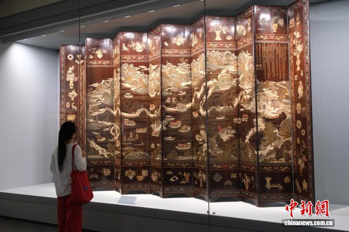9月11日,游客在館內(nèi)的《刻灰西湖全景圖十二扇漆器屏風(fēng)》前駐足。曹丹 攝