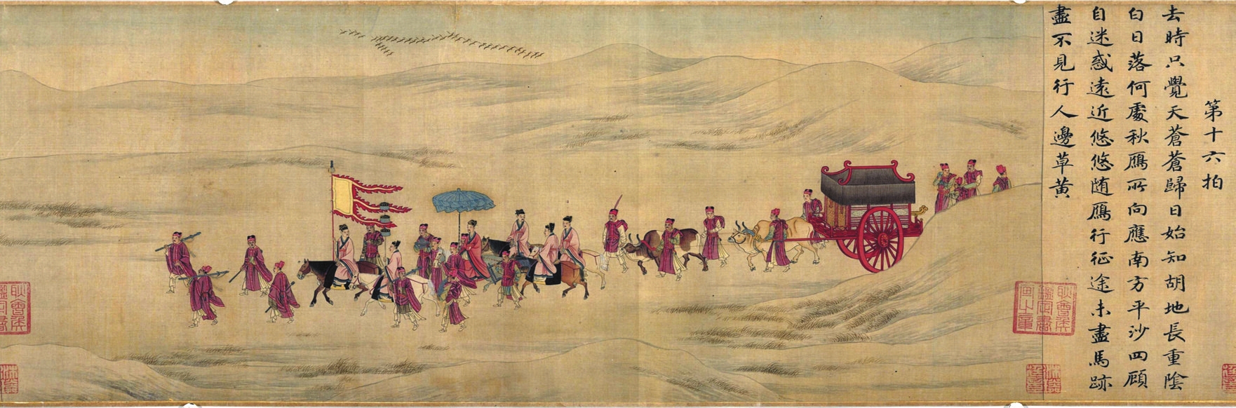 通過出土和存世的一些圖像,我們可以一窺漢代旄節(jié)之真容。洛陽燒溝61號西漢壁畫墓中的壁畫磚上繪有一持節(jié)使者;山東嘉祥武氏祠一組畫像中,描繪了漢使持節(jié)拜見王陵之母的場景,手中所持之節(jié)正是旄三重,只是看起來柄長不到八尺。至于“旄節(jié)之制”,漢代與先秦當(dāng)是有別的,將旄牛尾編成三重流蘇的制節(jié)之法始于漢,《事物紀(jì)原》載:“漢人有持節(jié),乃古旄也。然則節(jié)自周始,而旄節(jié)則起于漢也?!边@種持節(jié)使的形象,在南宋人所繪《胡笳十八拍》和《迎鑾圖》等表現(xiàn)外交題材的畫作中,仍有清晰體現(xiàn),可見這種持節(jié)出使的制度在古代一直延續(xù)。