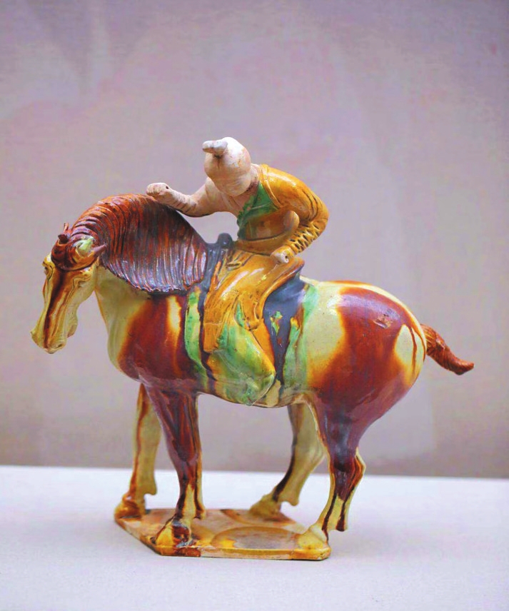 唐代女子也熱愛打馬球,《明皇擊球圖》展現(xiàn)了唐玄宗與后宮妃嬪打馬球的場景,河南洛陽唐代王雄誕夫人魏氏墓曾出土四件三彩打馬球女俑。唐代詩文中也有女子打球的記載,王建《送裴相公上太原》中寫“千群白刃兵迎節(jié),十對紅妝妓打球”,張籍的《寒食內(nèi)宴二首》亦云“廊下御廚分冷食,殿前香騎逐飛球”的詩句。由于馬球運動的流行,唐代有很多與馬球相關(guān)的文物,流傳至今的馬球、球桿、球場碑石、繪畫、泥塑等數(shù)不勝數(shù)。