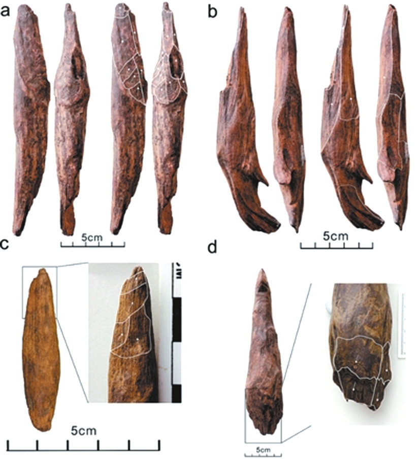 在沒有鎬、鏟等金屬工具的情況下,生活在甘棠箐遺址的古人群是如何將深埋于地下的可食性植物根塊挖掘出來(lái)并加以食用的?遺址出土的木質(zhì)材料給我們提供了答案:古人類制作和使用了木器。在該遺址發(fā)掘出土的近千件木質(zhì)材料中,35件被鑒定為人類加工的木器。這些木器主要用松樹制作,器身挺直光滑,一端或兩端被加工成尖狀,尖部形態(tài)包括鑿型、鏟型、錐型等。其中兩件是需雙手持握的大型挖掘棒,還有4件具有獨(dú)特的鉤狀尖刃,可用于切斷植物根系,其余則為可單手持握的小型挖掘工具。