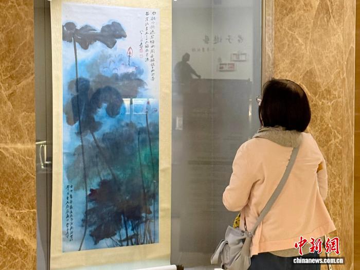 11月4日,于右任、徐悲鴻、張大千等名家書畫臺(tái)北展出。圖為觀眾駐足欣賞張大千畫作《潑彩荷花》。中新社記者 朱賀 攝