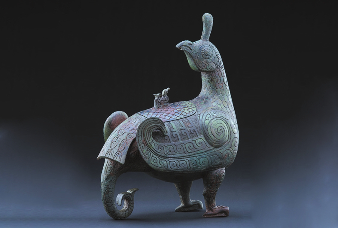 山西,東倚巍峨太行,西臨滔滔黃河,表里山河。作為中華民族的重要發(fā)祥地之一,這里地上地下的古代遺珍燦若星辰。晉侯鳥尊,高39厘米,長30.5厘米,寬17.5厘米。整個器物以佇立回首的鳳鳥為主體造型,鳥頭微昂,圓睛凝視,高冠直立,體軀豐滿,兩翼上卷。鳥背依形設蓋,蓋鈕為小鳥形,與鳳鳥對望,雙腿粗壯,爪尖略蜷。全身布滿了精美紋飾,頸、腹、背裝飾羽片紋,兩翼與雙腿裝飾云紋,翼、蓋間裝飾立羽紋,以雷紋襯底,尾部裝飾華麗的羽翎紋。