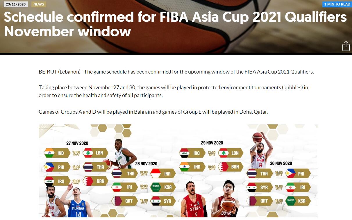 據(jù)介紹,由于相關(guān)防疫規(guī)定,有些國家和地區(qū)籃協(xié)所屬政府當局不允許球隊進行國際旅行,進而導致有些球隊無法參加本窗口期比賽,國際籃聯(lián)被迫對亞洲杯預選賽11月窗口期賽程進行調(diào)整。