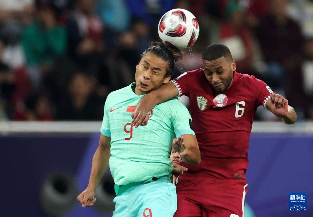 1月22日,中國隊球員張玉寧(左)與卡塔爾隊球員阿卜杜勒·哈特姆爭頂。新華社記者 曹燦 攝