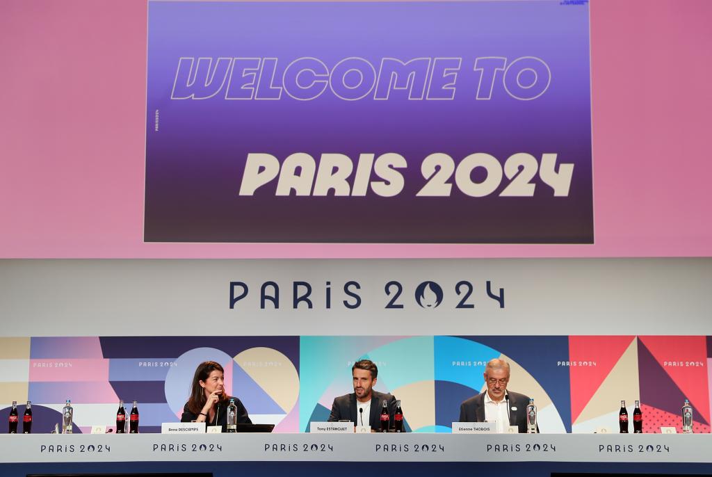 7月21日,巴黎奧組委主席托尼·埃斯坦蓋(中)在發(fā)布會(huì)上發(fā)言。新華社記者 王東震 攝